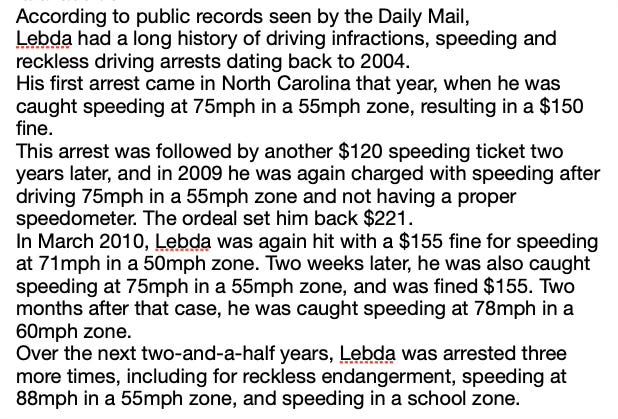 There’s no way Lebda could’ve known something like this might occur. Especially given his spotless driving record.